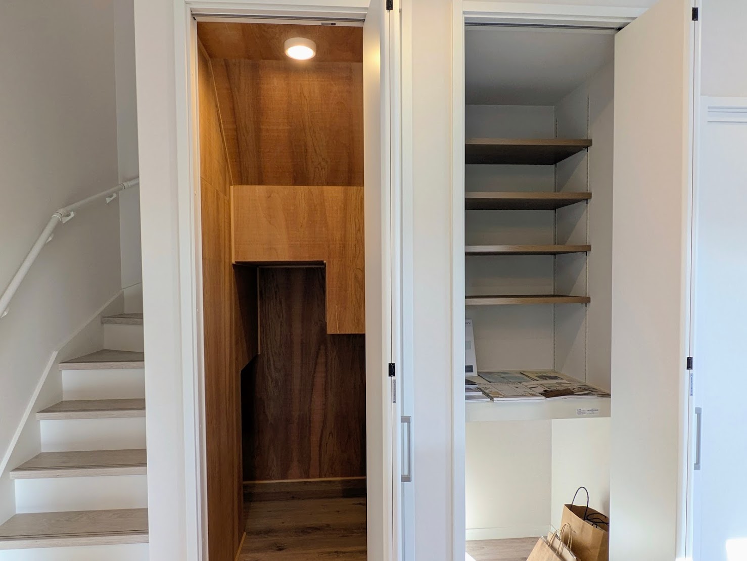 階段下のスペースを活用し収納スペースもしっかり確保。インターネット配線用の中段、可動棚やコードレス掃除機の充電場所としても活用できるよう足元にコンセントも完備。
