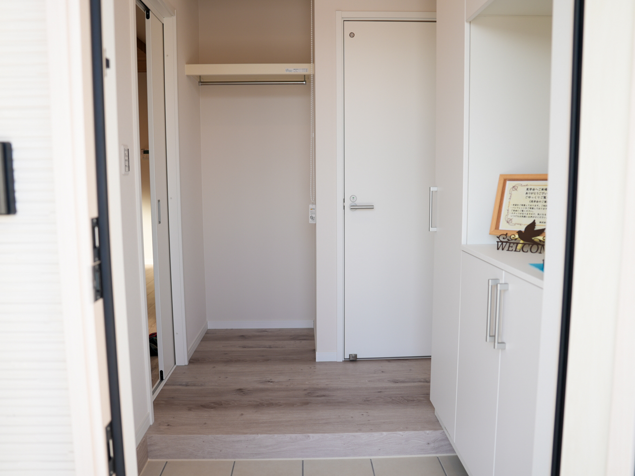 なるほど~! さらに玄関ホールには、ロールスクリーンで目隠しできる収納スペースが。 ここにはハンガーパイプがあり、