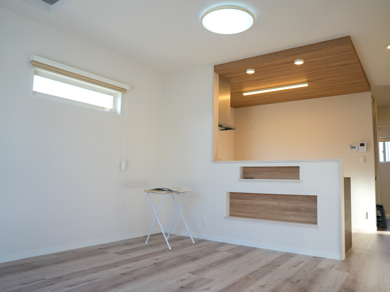 まず、こちらのリビングですが、キッチンカウンターの足元、 ダイニングテーブルの下に来る位置に「ニッチ(飾り棚)」を設置。ティッシュやリモコン、雑誌の置き場所に困りません!