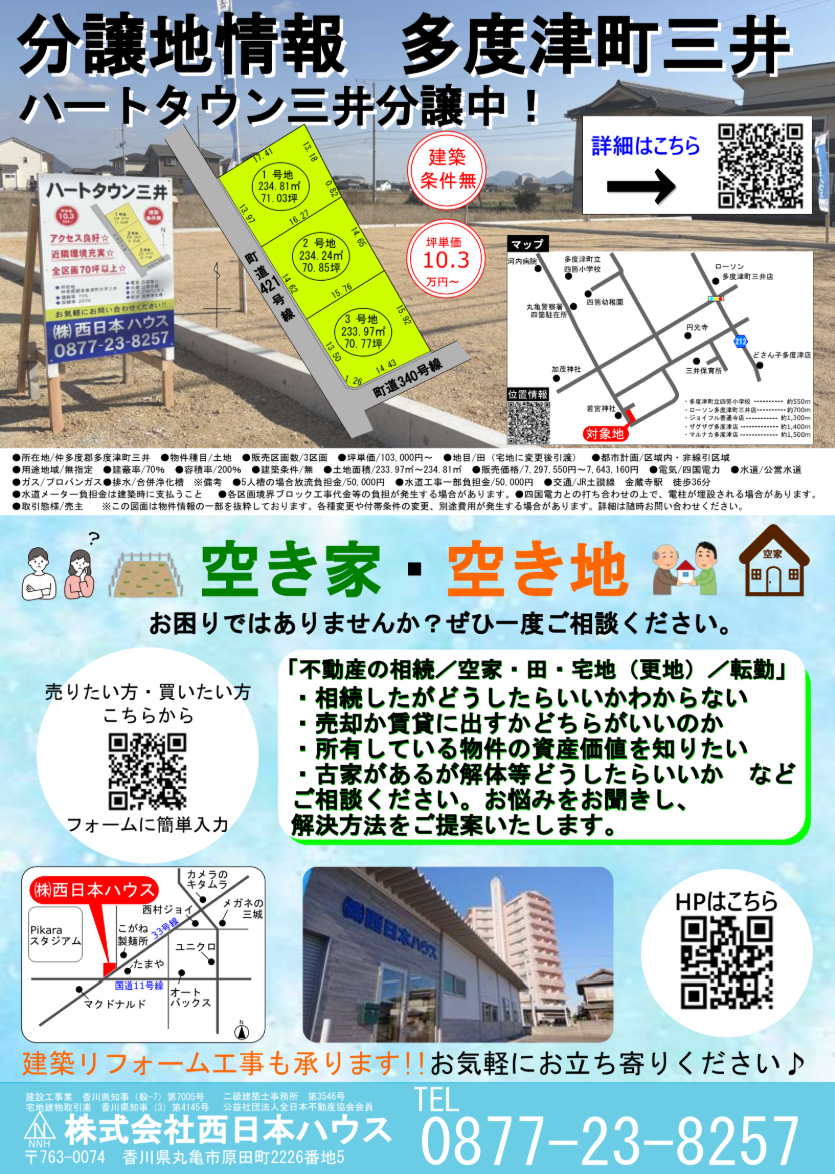 最後に、土地をお探しの方へ情報です。現在、多度津町三井で「ハートタウン三井」を分譲中です!