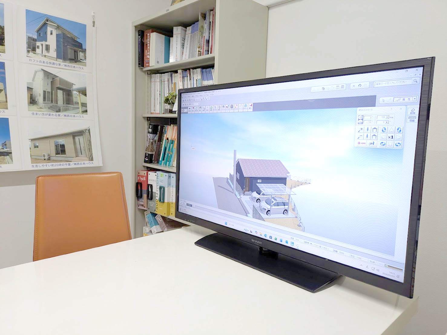 今回の建売は完成済みですが、これから建てる方や、リフォームの相談では、このモニターを使って3Dパースを見ながら打ち合わせができるそう。 「壁紙を変えたらどうなる?」「家具を置いたら?」というイメージをその場で確認できるのは楽しいですね!