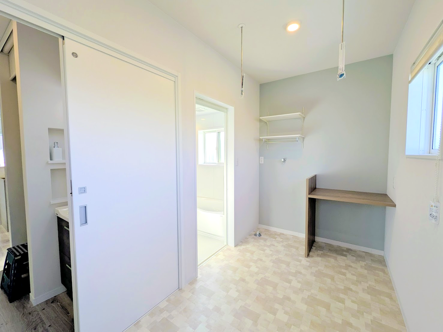 広々とした脱衣室には、室内干し用のポール(ホスクリーン的なもの)が標準装備され、洗濯機横にはアイロンがけもできちゃうカウンターが!