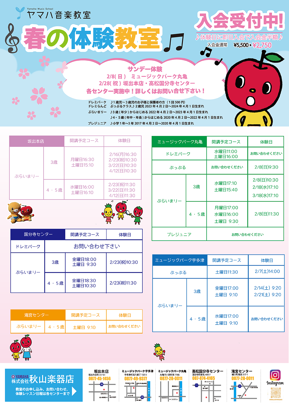 秋山楽器店さんが運営する5か所のヤマハ音楽教室では、現在、春の体験教室を受付中です!