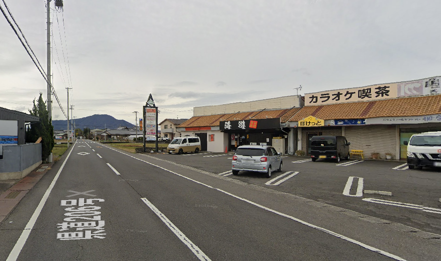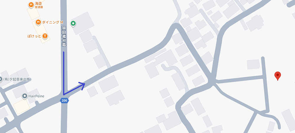 写真の「居酒屋海遊」「ダイニングM」などの店舗が見えてきたら、すぐ先の交差点を左折し東へ進んでください。