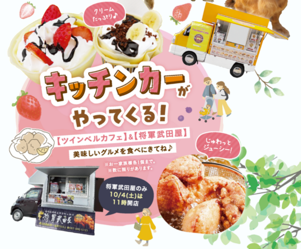 イベントにはキッチンカーも来るようなので、ふれあいの合間のおやつにちょうどいいですね。※一家族様各1個まで。※数に限りがあります。