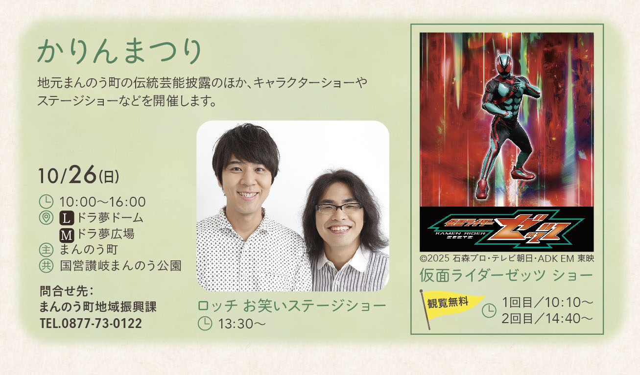 国営讃岐まんのう公園で「まんのう町かりんまつり」が2025年10月26日(日)に開催される!人気芸人のロッチ&仮面ライダーで大盛り上がりな予感♪