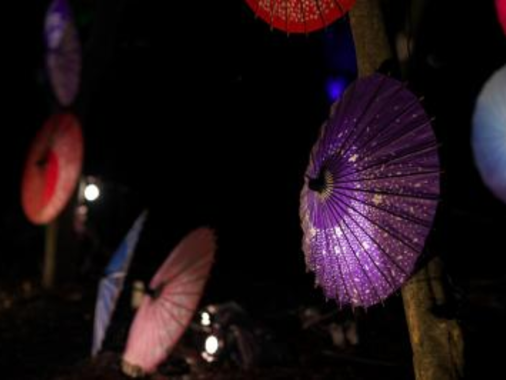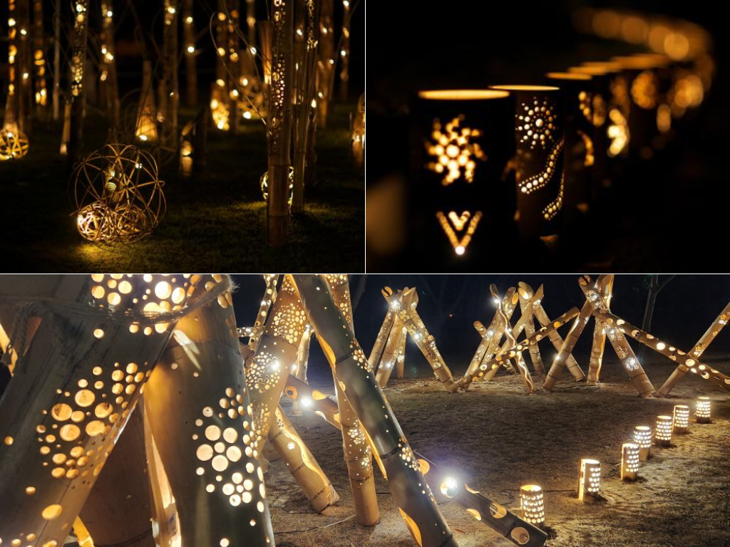 夜の公園へ一歩足を踏み入れた瞬間、竹の中からこぼれるやわらかな灯りと、個性あふれるアートたちが織りなす幻想的な世界に包まれ、思わず息をのんで立ち止まってしまうような、そんな美しい光景です。