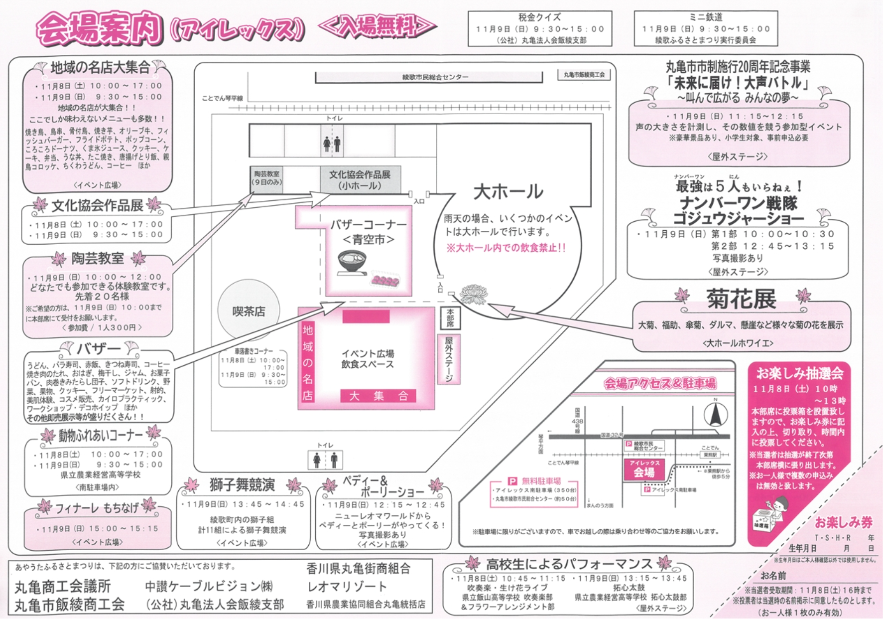 - 文化協会芸能発表(綾歌火天狗太鼓、元亜矢女会、綾歌吹奏楽団ほか)、吹奏楽と生花ライブ(県立飯山高校 吹奏楽部)、拓心太鼓(県立農業経営高校 拓心太鼓部)