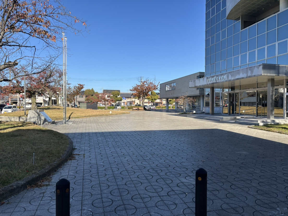 写真右側のガラス張りの建物が役場本館前ですね。本館前の幾何学模様のスペースに「イベントブース」が設置されるようです。ワークショップや体験系、販売系がこの場所かもしれませんね。