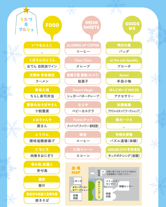 宇多津商工会が主催ということで、普段のイベントではあまりお目にかかれないお店の名前もちらほら見えますね。家族みんなで楽しめる大満足なマルシェになりそうな予感!是非足を運んでみてください!