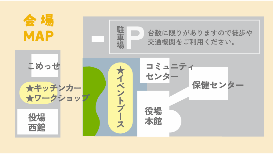 本館前の道を挟んだ西向かいにある役場西館の駐車場キッチンカーやワークショップが並ぶようです。