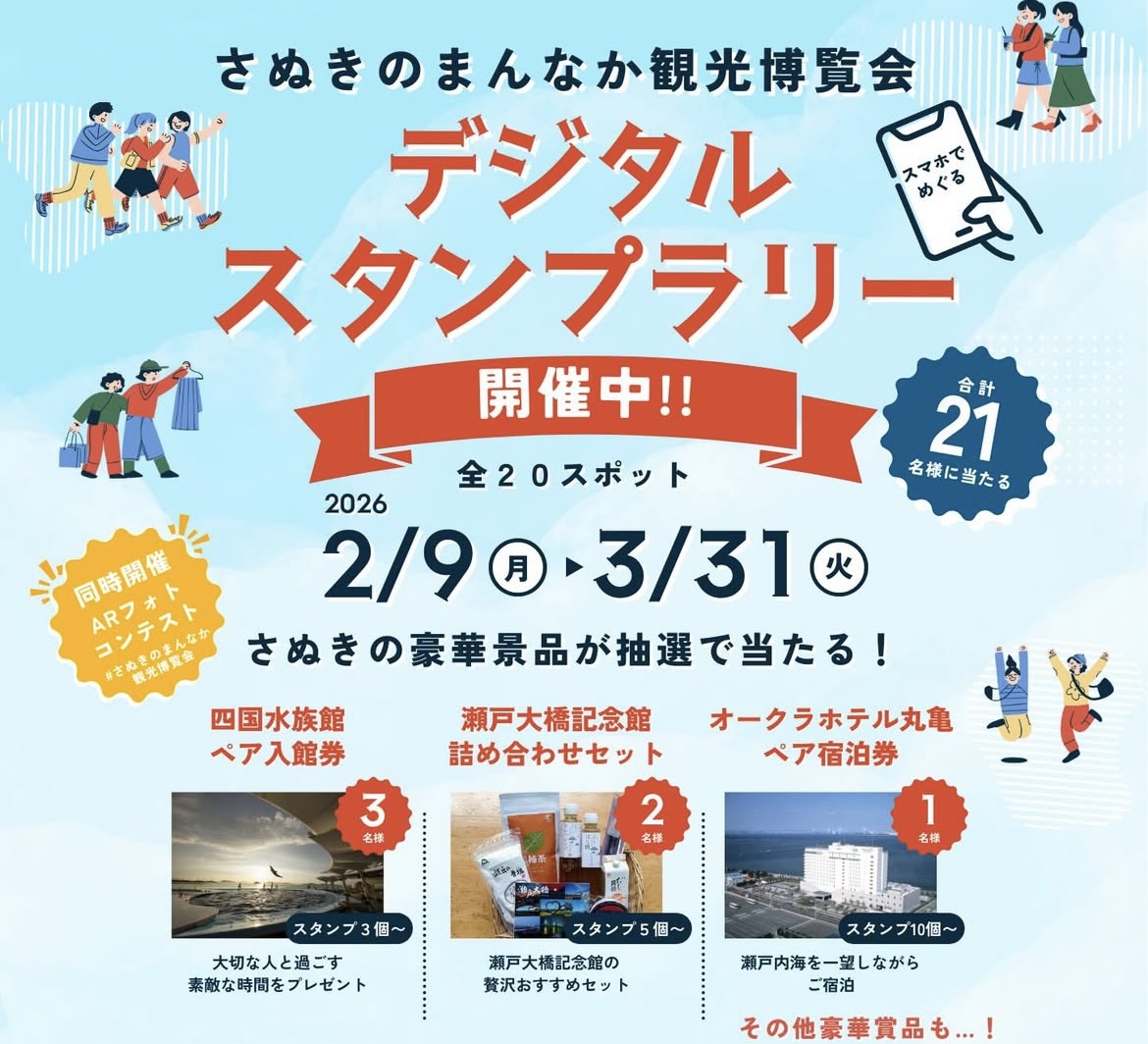 中讃地域の全20スポットで「さぬきのまんなか観光博覧会 デジタルスタンプラリー2026&ARフォトコンテスト」が開催されています。