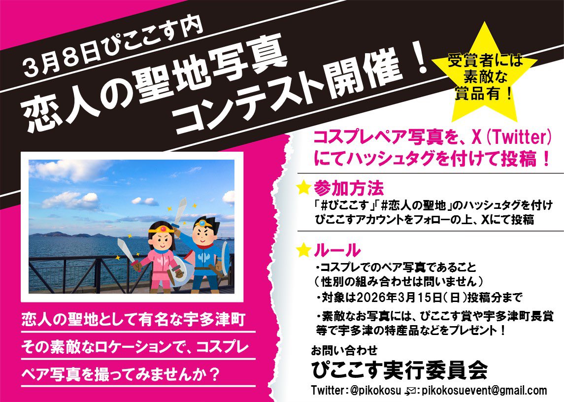 宇多津町といえば「恋人の聖地」としても有名ですよね。今回も、その素敵なロケーションを活かした「コスプレペア写真コンテスト」も同時開催!