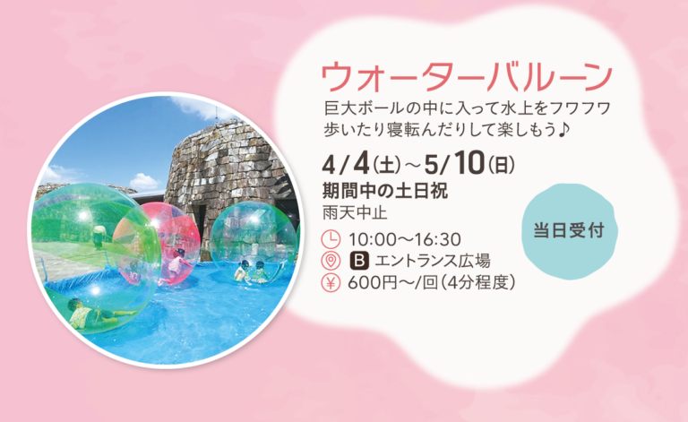 巨大ボールの中に入って水上をフワフワ歩いたり寝転んだりして楽しめるみたいです!受け付けは当日でOKです!