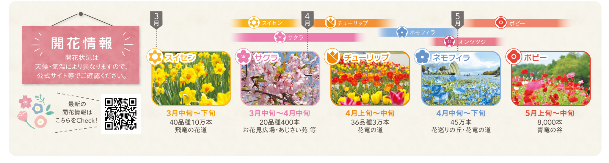 最新の開花状況はこちらから確認できるので、気候や花の開花状況に合わせて遊びに行きたいですね!
