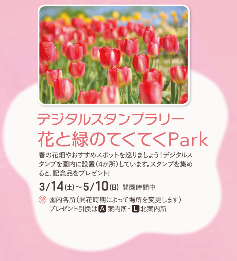 園内の春の花畑やおすすめスポットを回るスタンプラリーが開催されます。デジタルスタンプを4ヶ所集めて記念品をゲット!