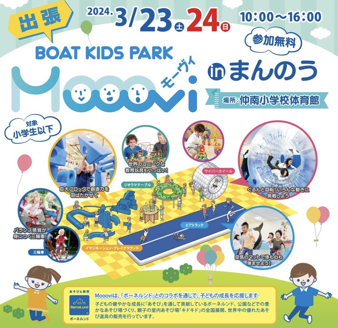 まんのう町で「出張BOAT KIDS PARK Mooovi in まんのう」が2024年3月23日(土)と3月24日(日)に開催されるようです。