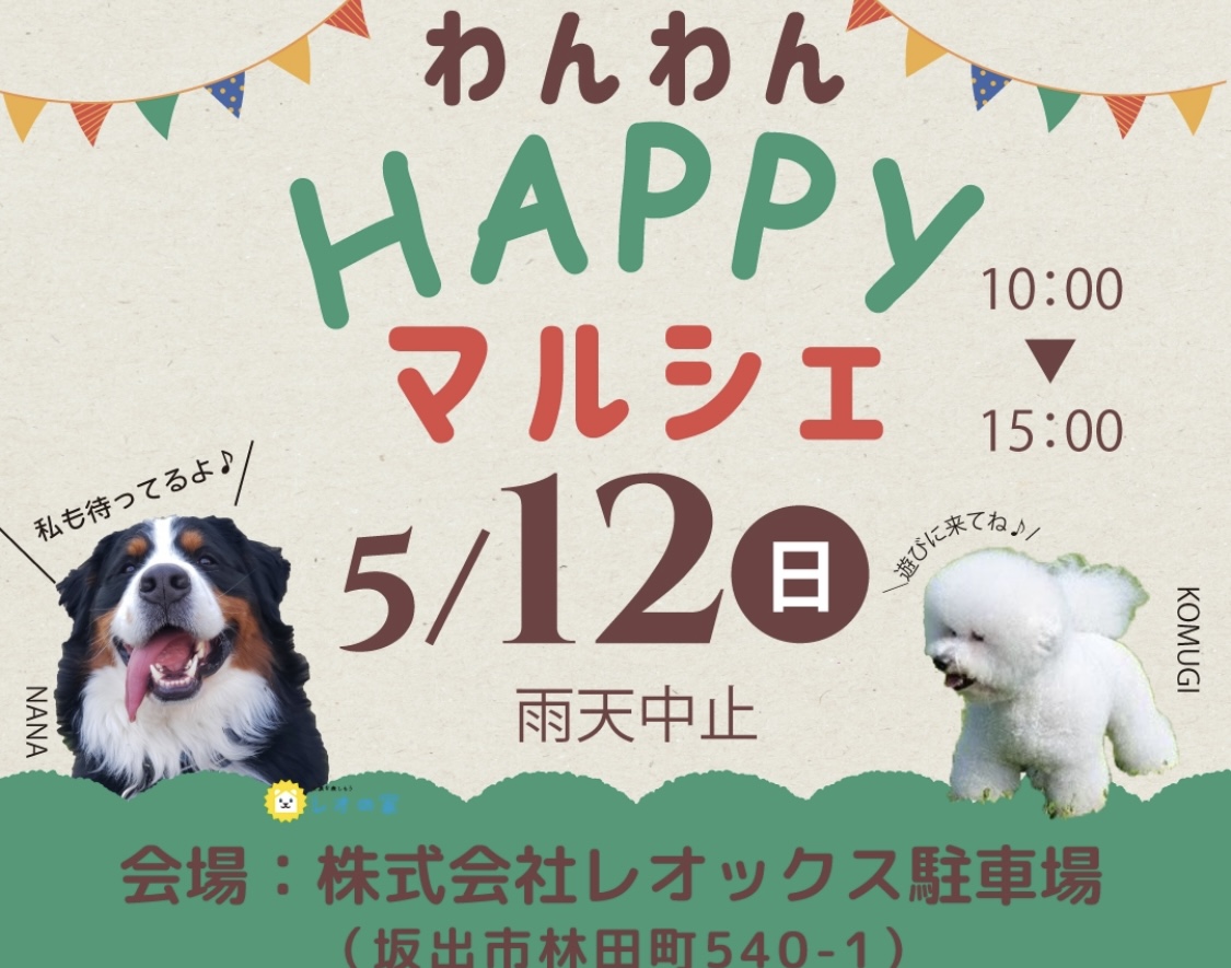 【中止】坂出市林田町の「株式会社レオックス」で「わんわんHAPPYマルシェ」が2024年5月12日(日)に開催されるみたい