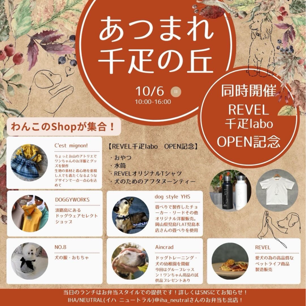 「千疋の丘~空と風のテラス~」で定期的に開催されてるわんこイベント「あつまれ千疋の丘」にて、今回は9月にオープンした「REVEL工房Open記念イベント」も同時開催されるそうです!