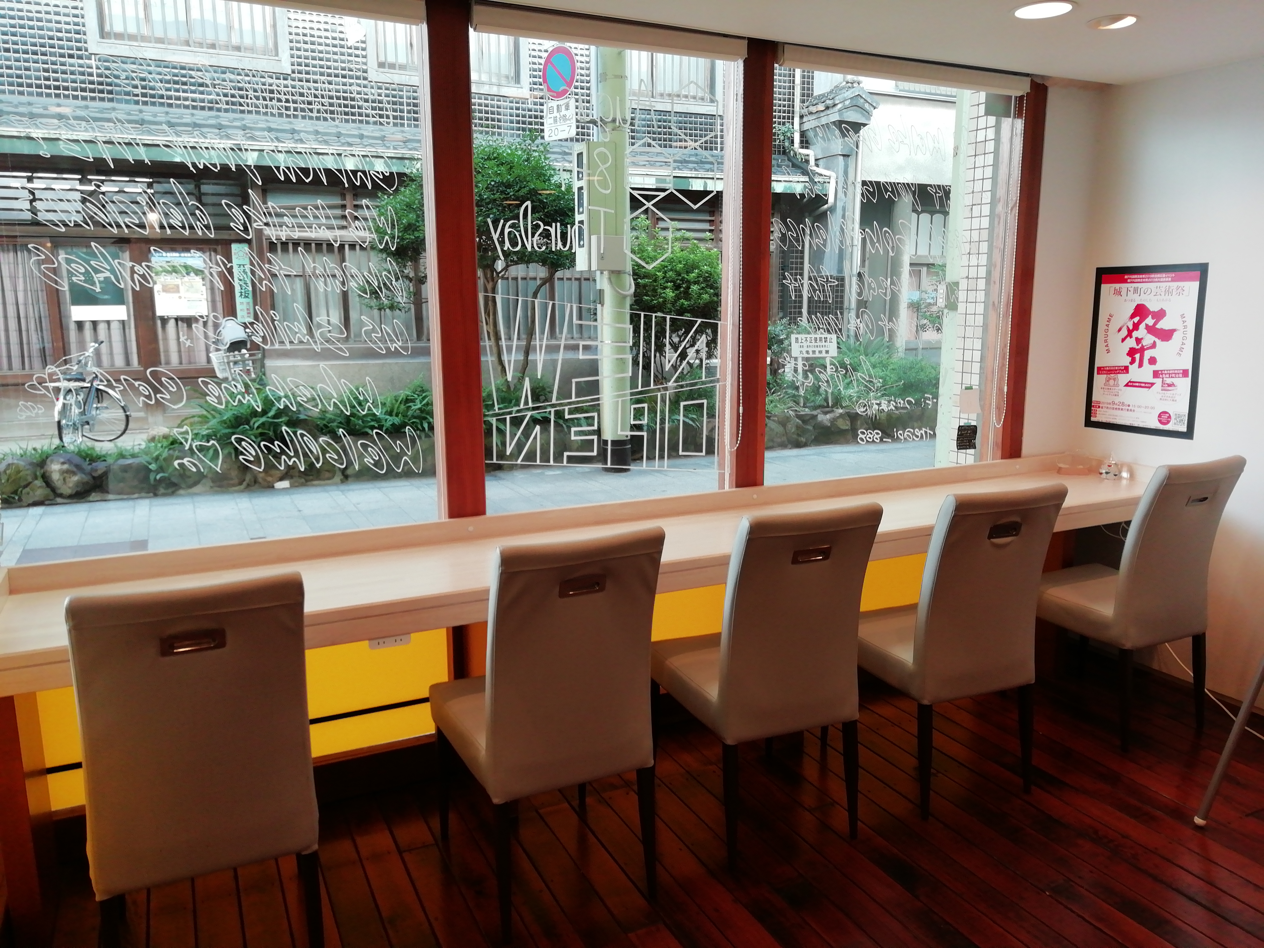 店内にはイートインスペースがあり、各種ドリンクも購入できます。向かい側は「秋寅の館」ですので、ウインドウ越しに路上イベントを観ながらパンを食べるなんてこともできます。