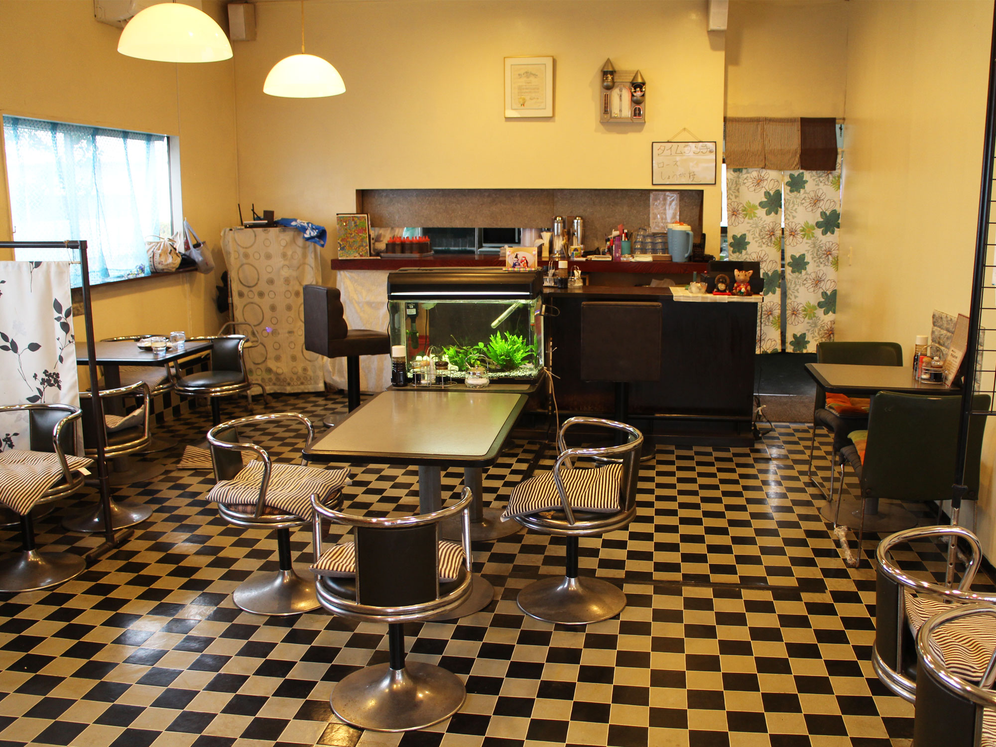こじんまりとしたカフェですが、モノトーンチェックの床が奥行きを感じさせ、緩やかなムード漂う店内です。