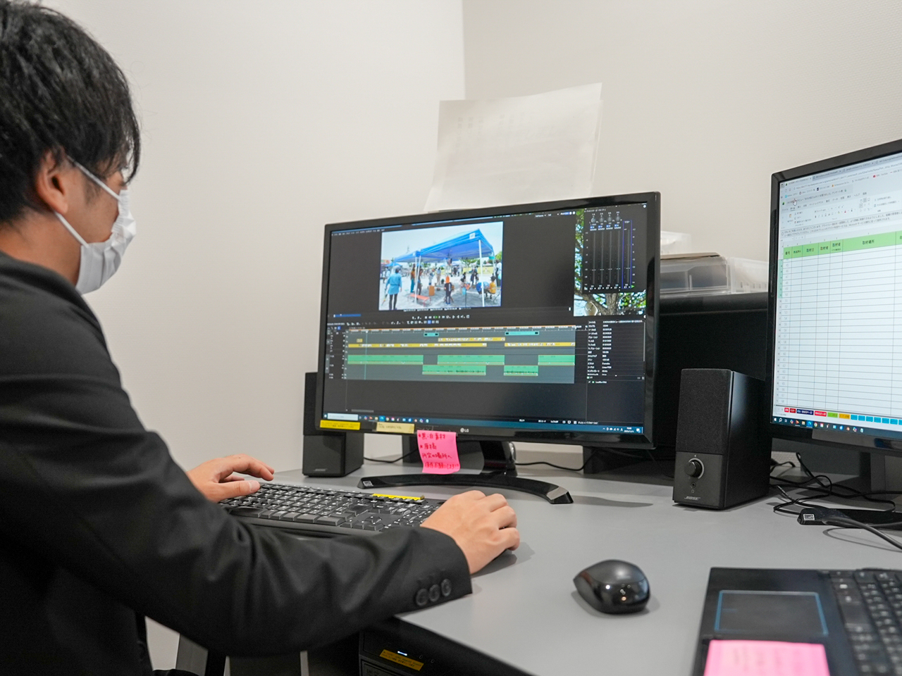 映像制作は完全に未経験スタート。カメラも編集機材も触ったことがなくて最初は大変でした。でも先輩社員やプロカメラマンの方がめちゃくちゃ丁寧に教えてくれて、今では「もっとスキル盗んでやる!」って感じです(笑)