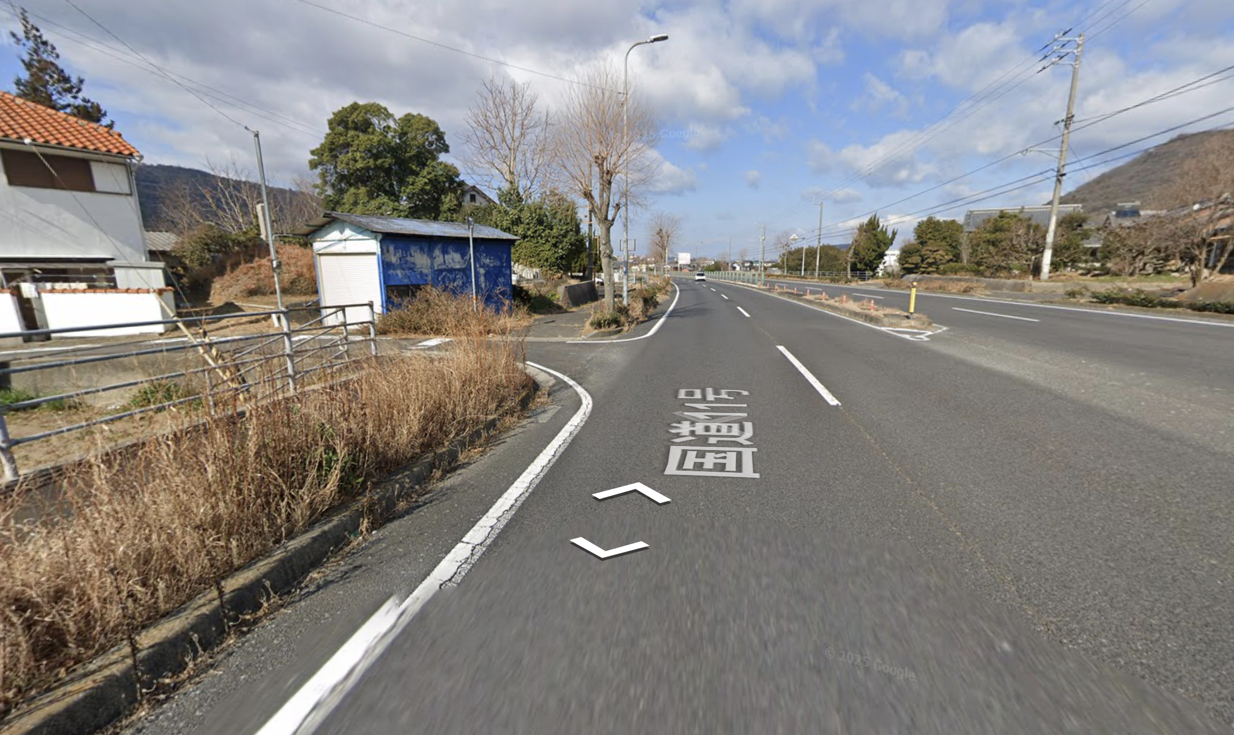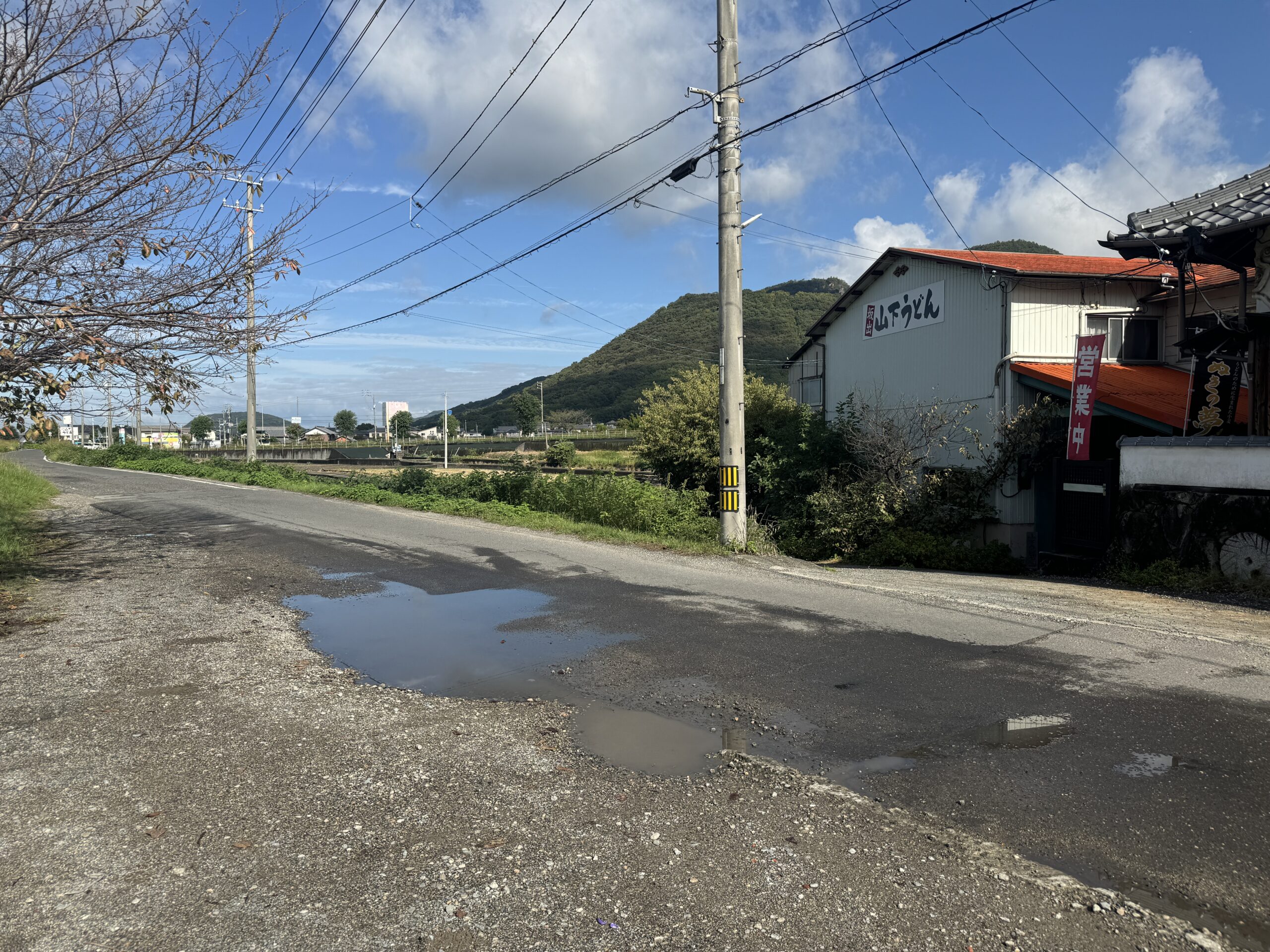 車で行く場合、JR国分駅から関の池を挟んだ県道11号線を鴨川駅方面に向かって進み、十字路を左に曲がります。つきあたりに伸びる綾川沿いの道を右に曲がると、電柱を挟んで道が二股に分かれており、手前(左手)側の道に建つ赤い屋根の建物に「山下うどん」の看板が見えます。