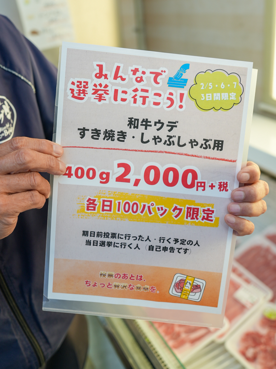 選挙って「自分が行っても変わらない」と思いがちですけど、一人ひとりの一票が地域を動かす力になると思っています。ぜひ投票に行って、そのついでに美味しいお肉も買いに来てください!