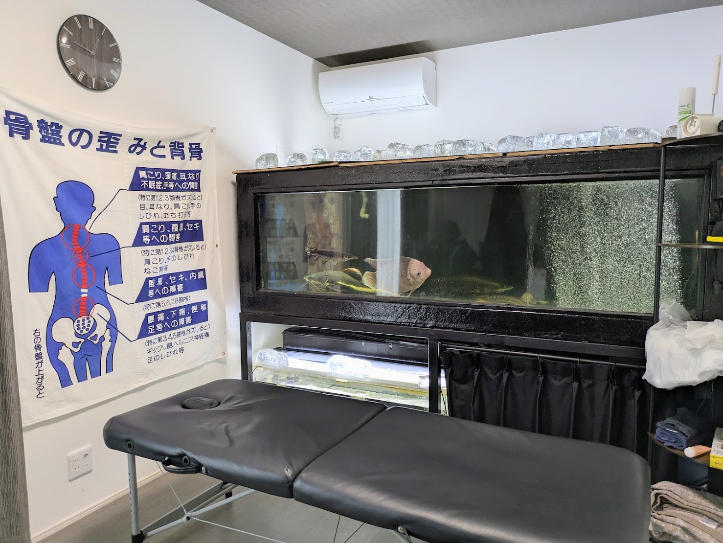お店(ご自宅の一室)に入ってまず驚くのが、視界に飛び込んでくる巨大な熱帯魚の水槽!院長の趣味だという熱帯魚たちがゆったりと泳ぎ、水槽から聞こえる「こぽこぽ」という優しい水の音が施術ルームのBGMです。この環境だけで、すでに自律神経が整いそうな気がします(笑)