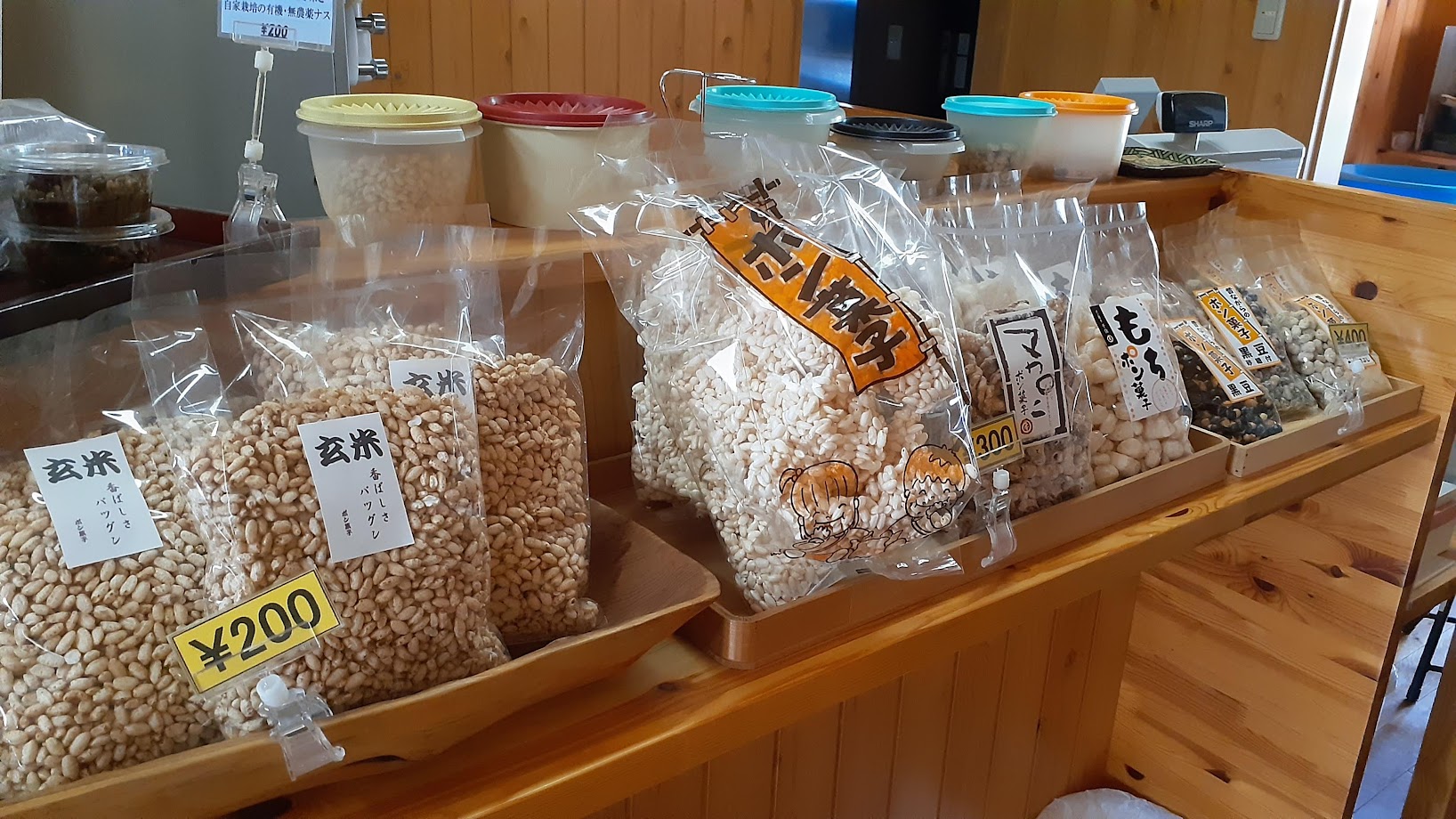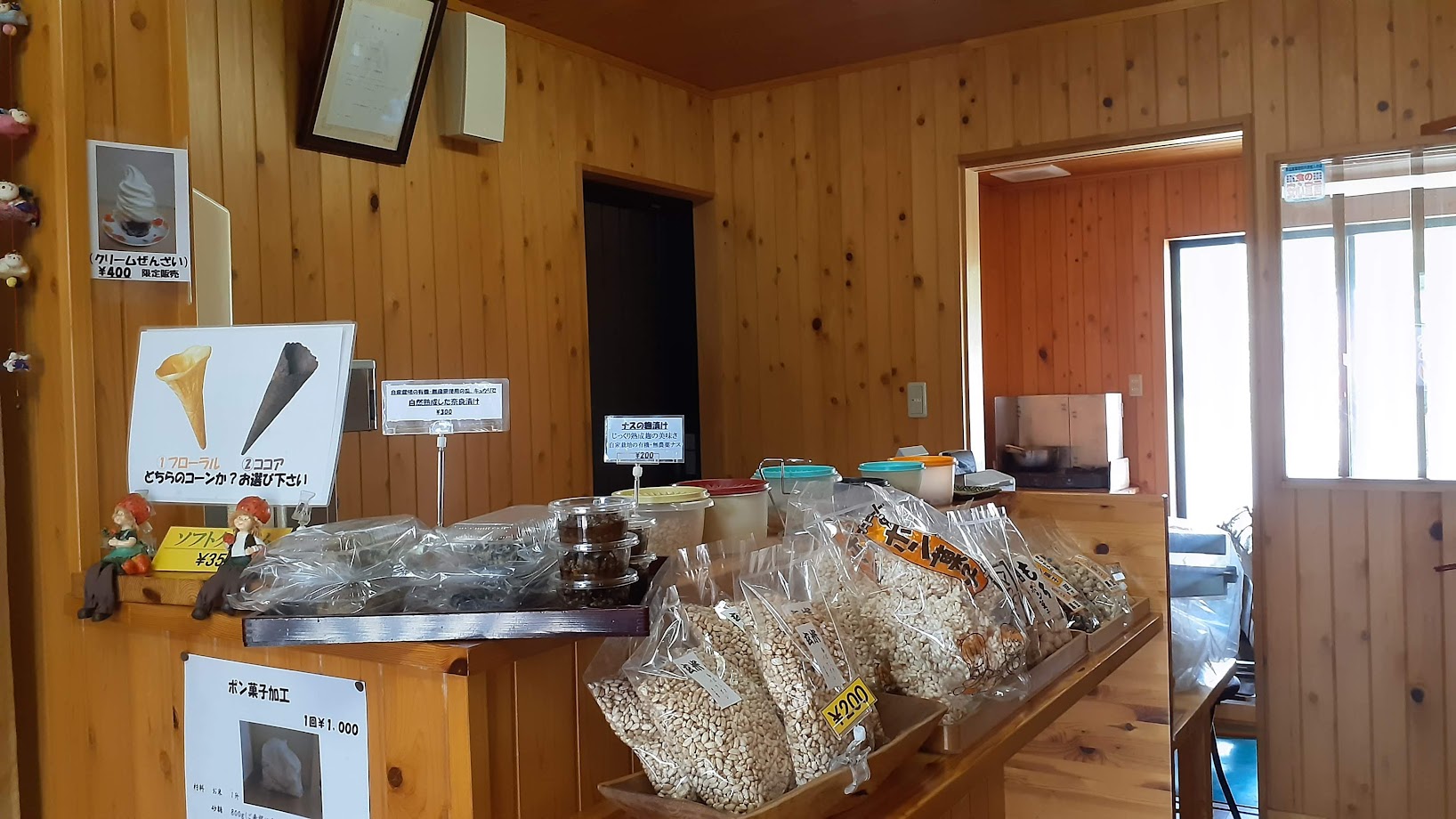 お店に入ってすぐのところに店内で加工されたポン菓子やお漬物などが並び、ソフトクリームもこちらで注文できます。気さくなご夫妻が出迎えてくれてアットホームな雰囲気となっています。