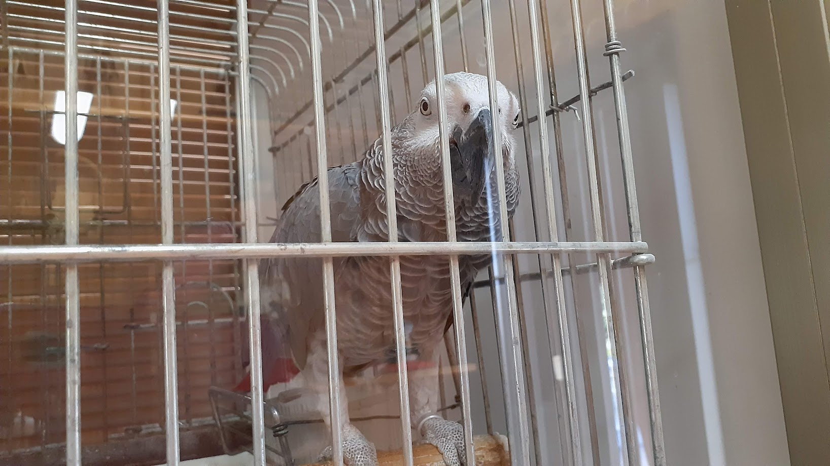 ガラス越しにヨウムの「ヨウちゃん」も出迎えてくれます。触ることはできませんが、どこか愛嬌のある表情の看板鳥です。