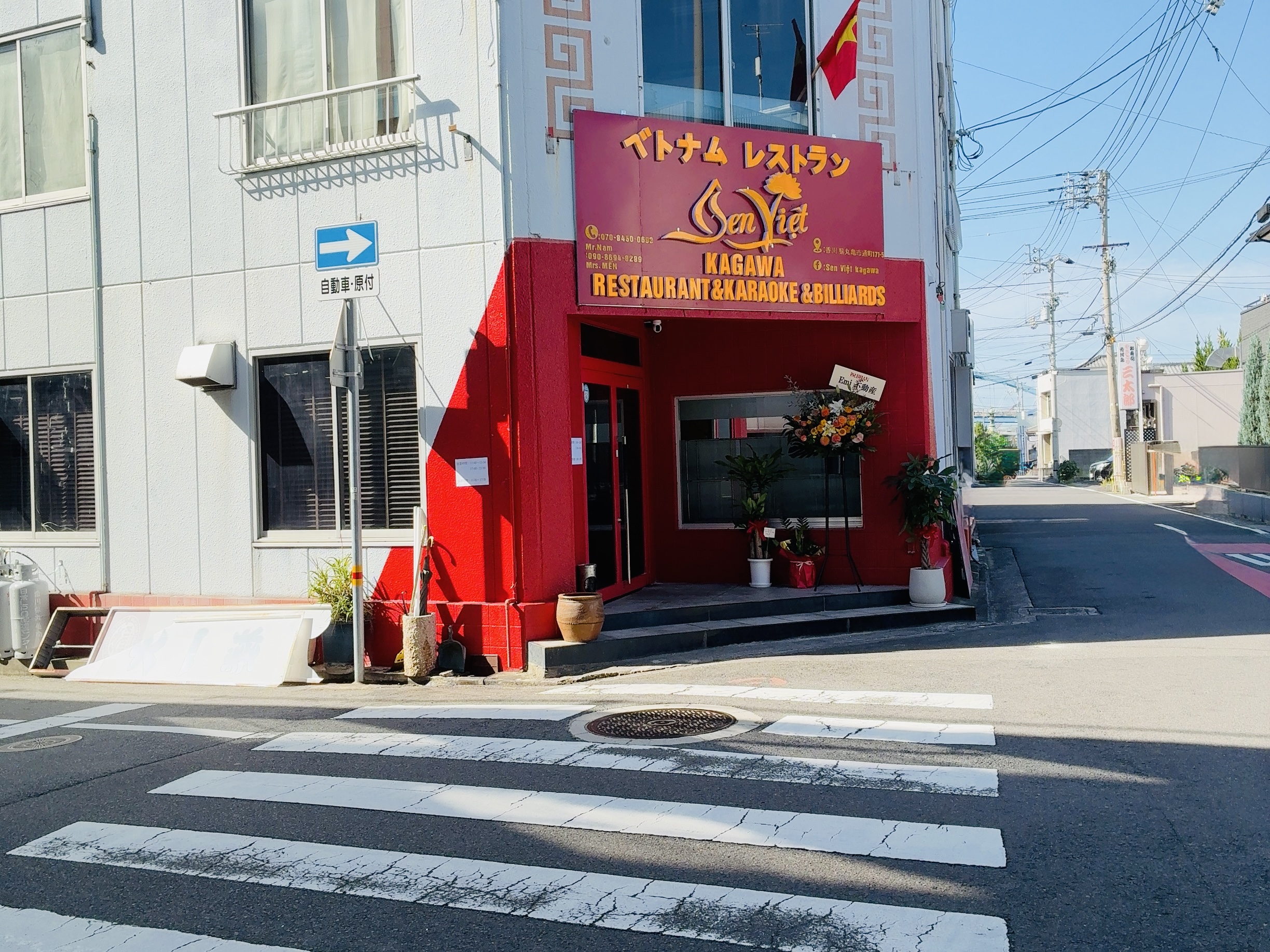 赤色と黄色の目立つ看板が設置されている「ベトナムレストラン Sen Viet Kagawa(センビエット香川)」。