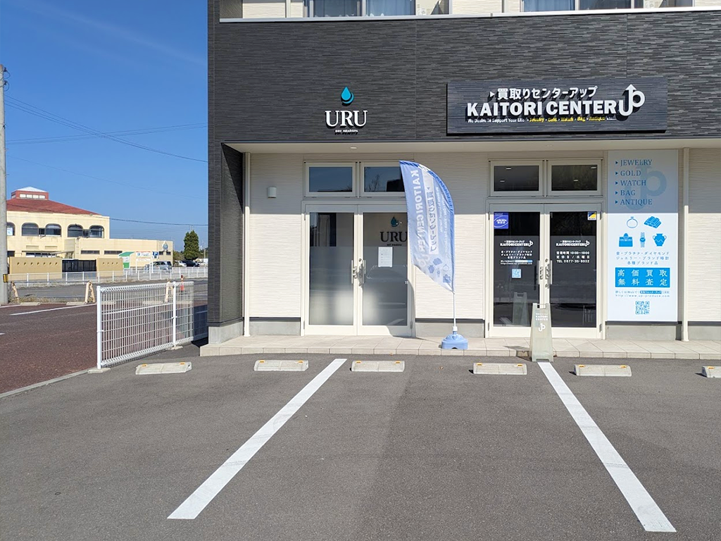 イオンタウン宇多津の東側の道を北へまっすぐ進むと、右手に見えてくる白い建物のいちばん北側に店舗があります。駐車場は店舗正面と共用スペースがあります。