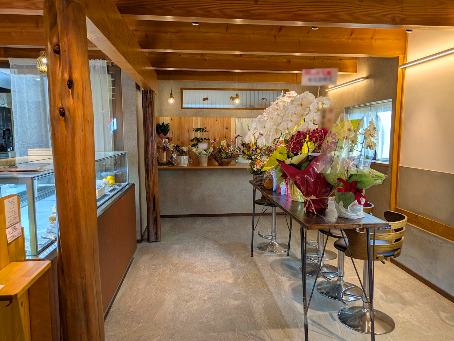 梁や柱の木目が生きるあたたかな店内には、ショーケースいっぱいに並ぶケーキや焼き菓子、そしてセンスあふれるこだわりのアイテムたちが並び、どこを見ても“ときめく”空間になっています。