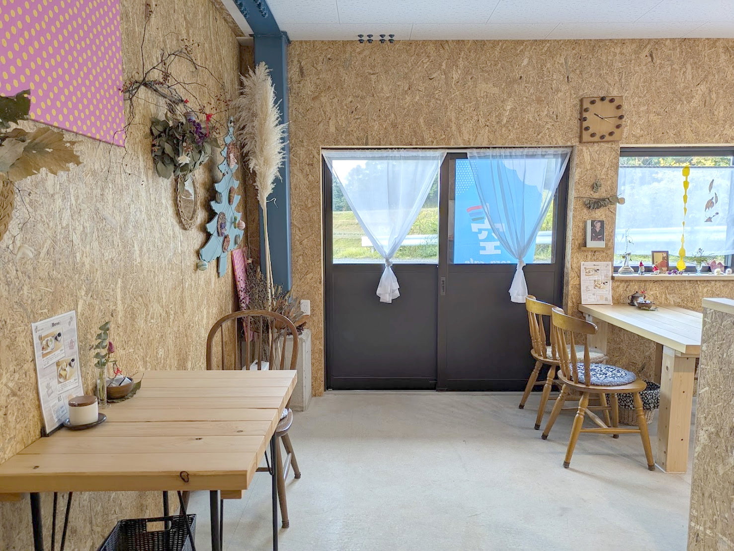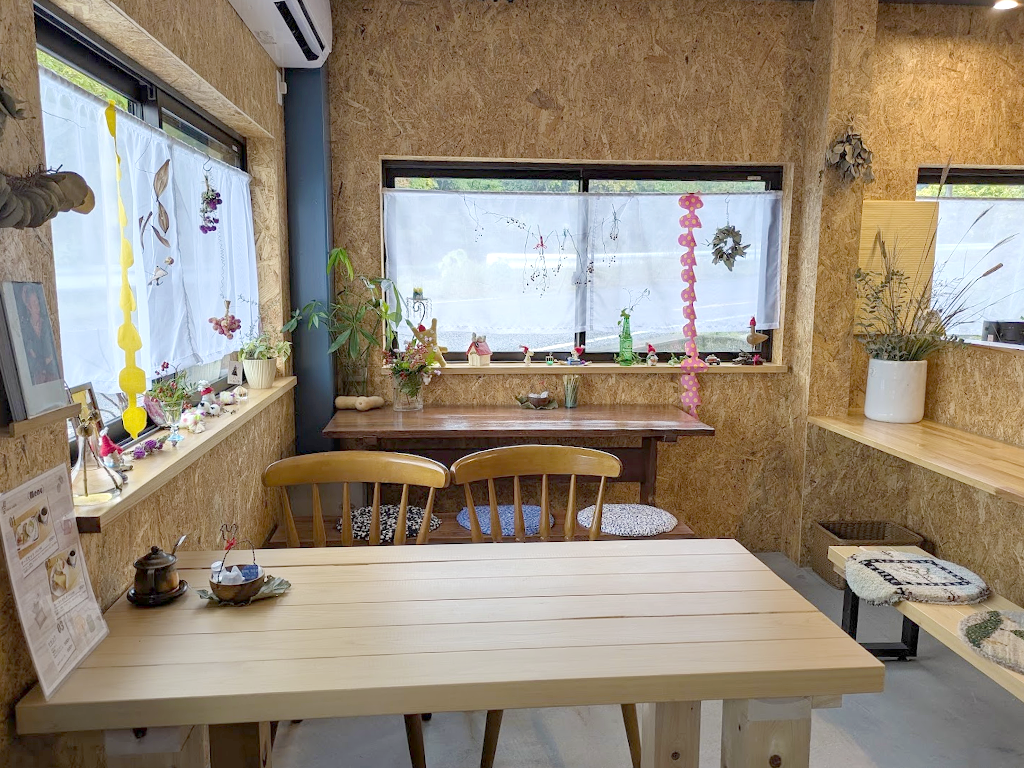 木のぬくもりがしっかり感じられる店内の壁にはドライフラワーや飾りがセンス良く並んでて、窓際にも小さな雑貨がちょこんと並んでます。