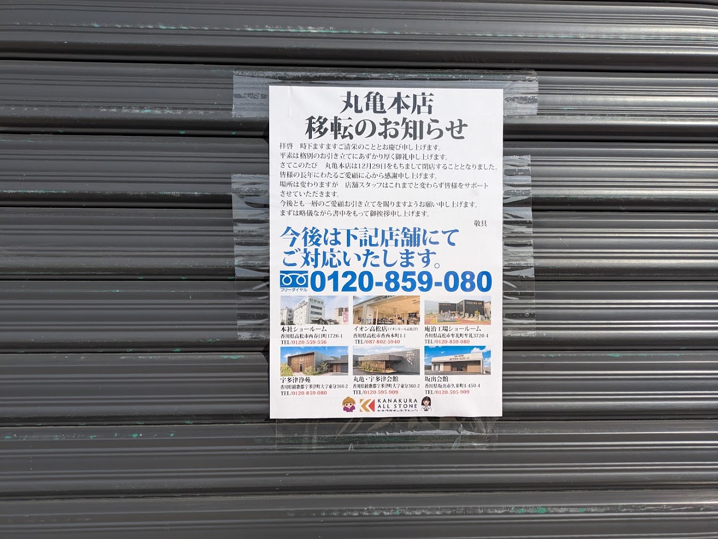 「年末だし、新しいお線香や仏具を準備しておこうかな」とXYZ丸亀モール内にある「カナクラ オールストーン丸亀本店」に立ち寄ってみたところ、お店のシャッターが全て閉まっていました。