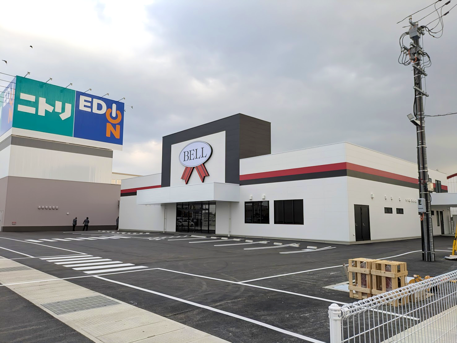 現在の店舗からすぐ南隣にスタイリッシュな新しい建物が完成しています! 写真を見ると、おなじみの「BELL」のロゴと赤いリボンが新しい外壁にバッチリ掲げられていますね。