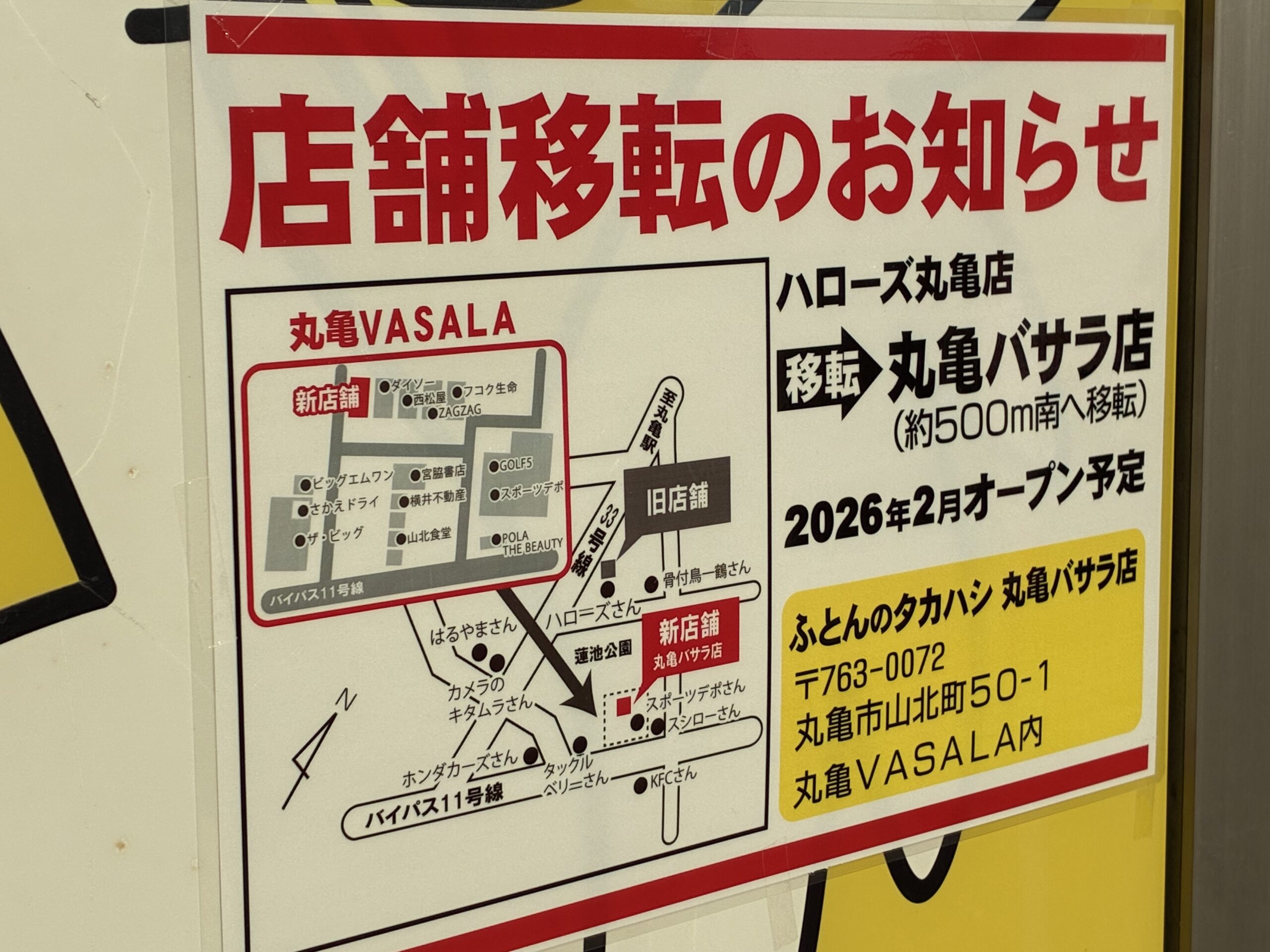 丸亀店の入り口に貼り出されているお知らせによると、2026年2月に「丸亀VASALA」内に移転オープン予定となっています!