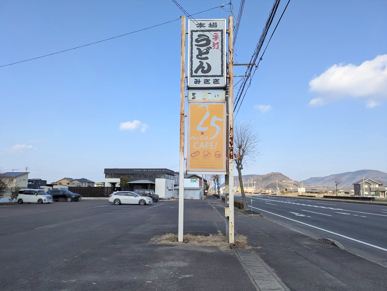国道11号線沿いの、うどん店「みささ」と一緒になった大きな看板が目印になっていて、敷地内にはかなり広い駐車スペースが完備されてます。