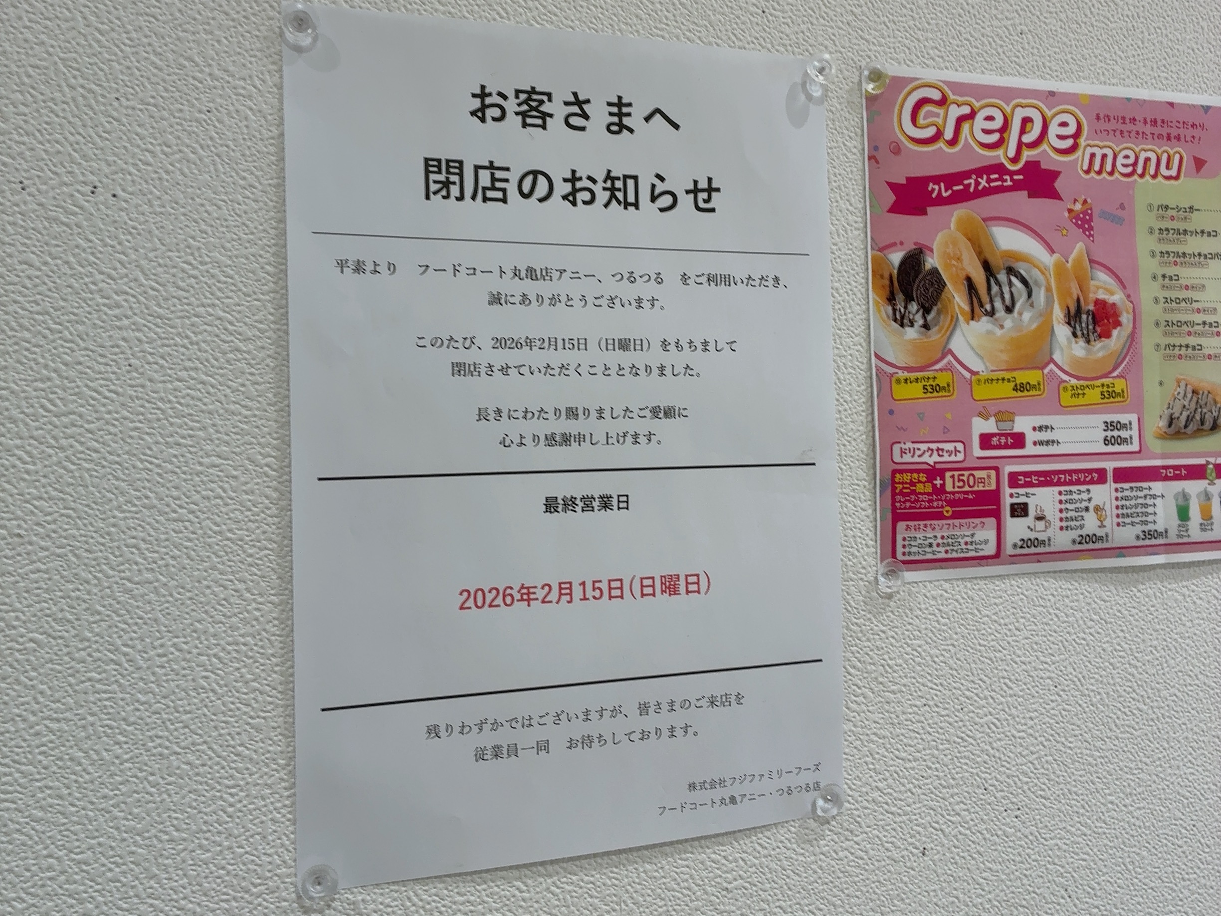 フジグラン丸亀の「フードコート丸亀店アニー・つるつる」が2026年2月15日(日)をもって閉店するようです。