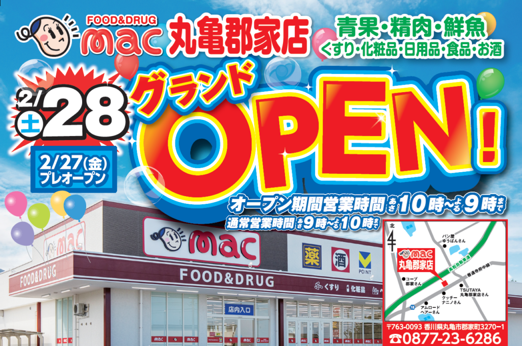 以前から「何ができるんだろう?」と注目が集まっていたあの場所に、ついに丸亀市郡家町に「mac丸亀郡家店」が2026年2月27日(金)にプレオープンし、その翌日の28日(土)にはグランドオープンするようです。