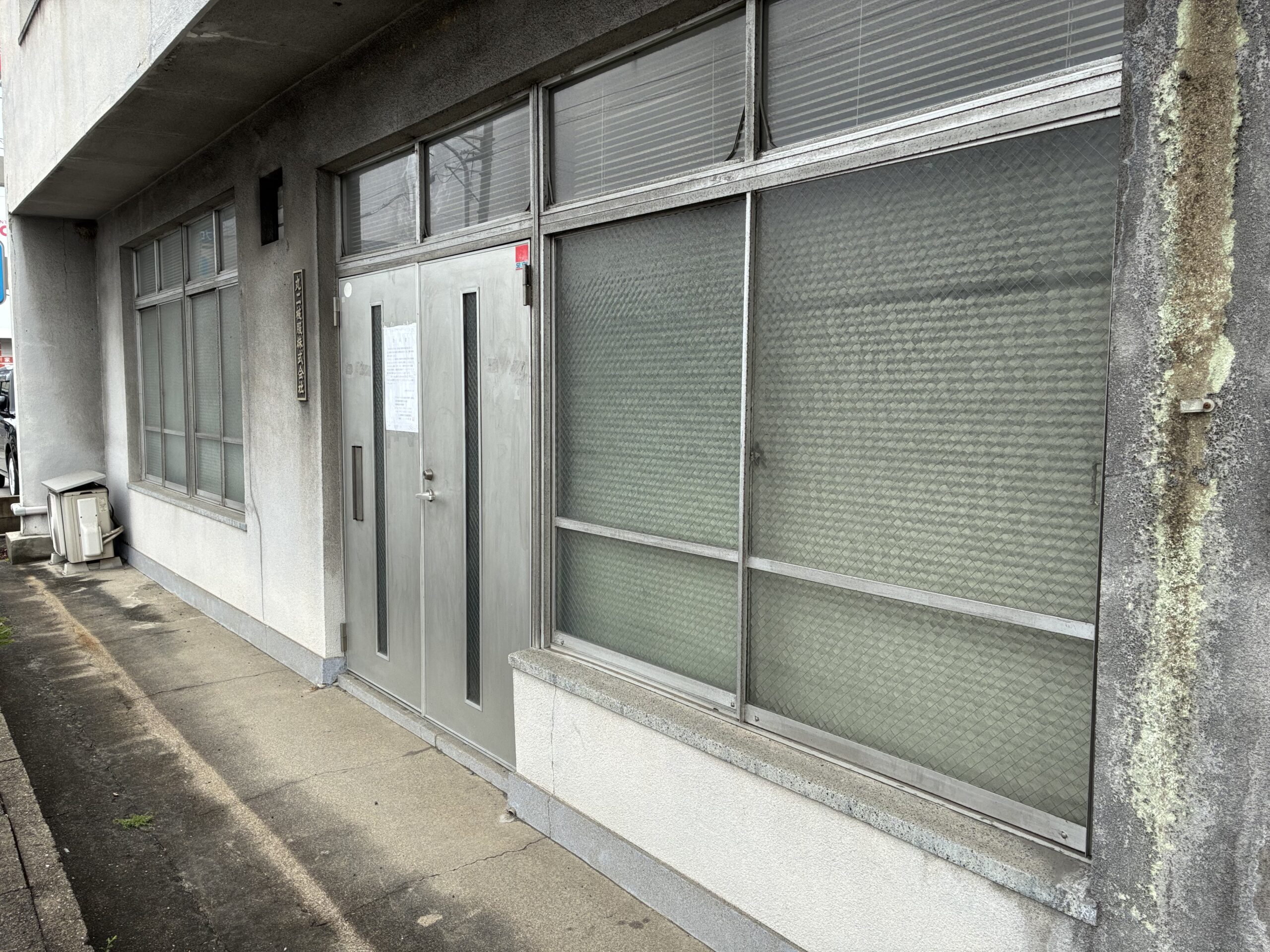 窓のブラインドが下りているため、中の様子は伺い知ることはできませんが、出入口のドアには大きな貼り紙があるのが分かりますね。