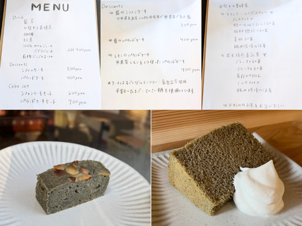 そんな「体にいい藍」をたっぷり使った藍のシフォンケーキやパウンドケーキ、そしてドリンクに藍茶・薬膳茶など揃えられてます。