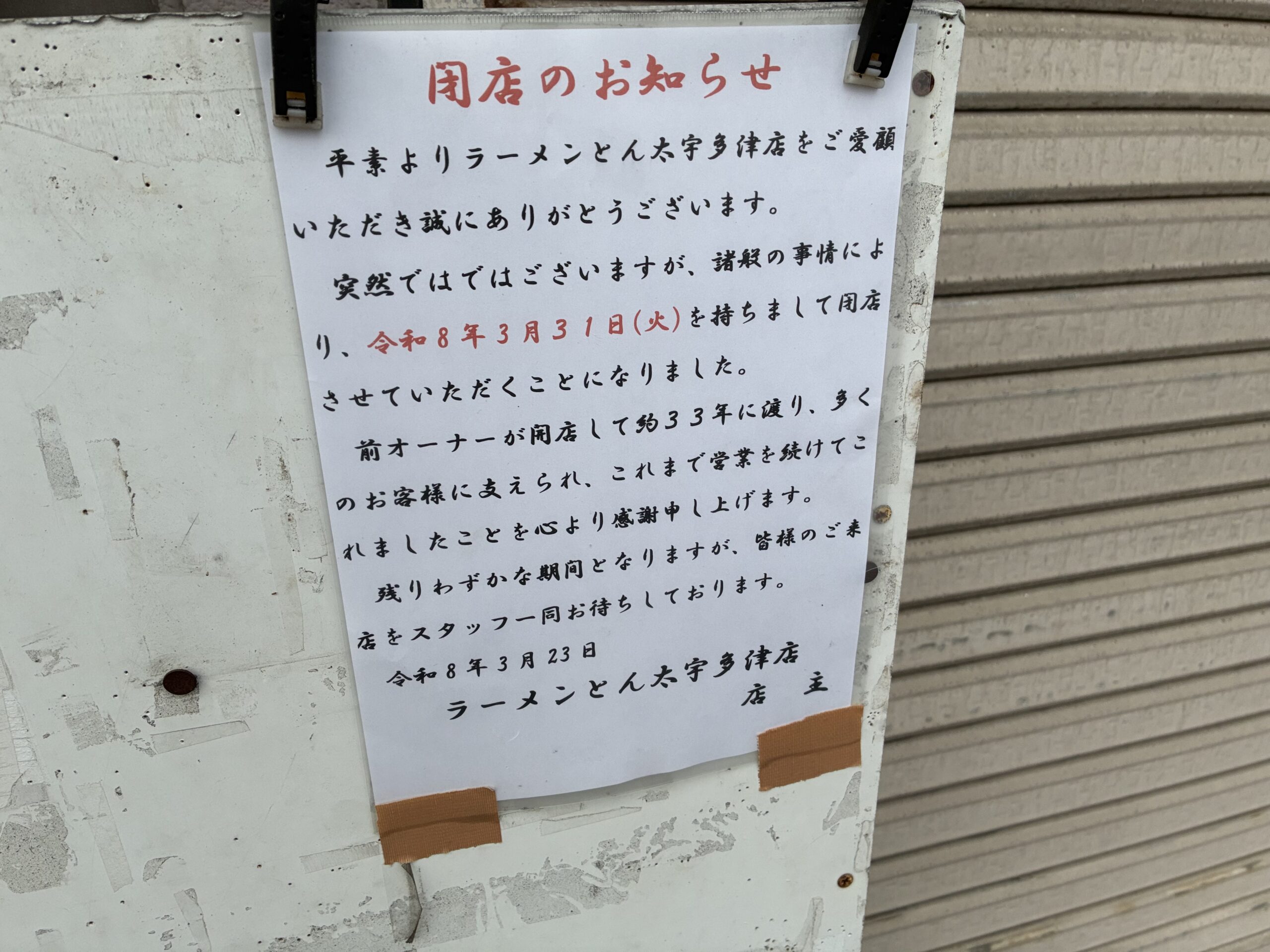 宇多津町のさぬき浜街道を通るたび、当たり前のように目にしていたあの看板。マンションの1階で長年親しまれてきた「ラーメンとん太宇多津店」が2026年3月31日(火)をもって閉店したようです。