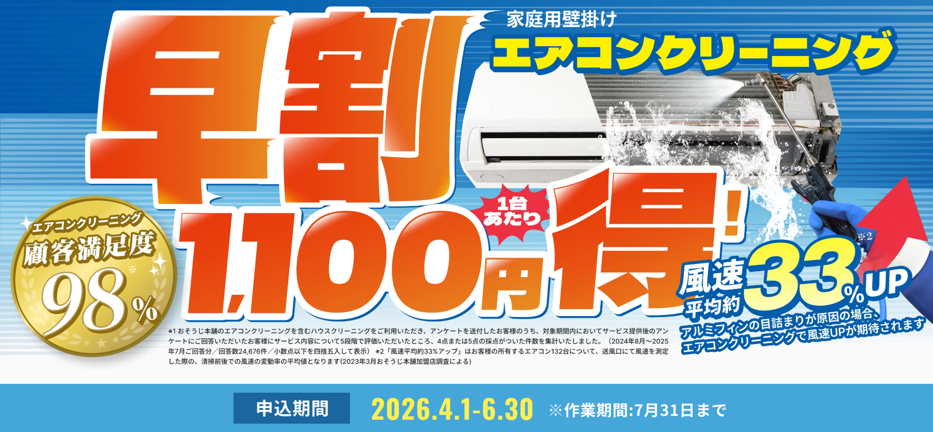 これから暑くなる季節に向けて、嬉しいニュースです。4月1日(水)~6月30日(火)までの申し込みで「エアコンクリーニング早割」が実施されるそうです!