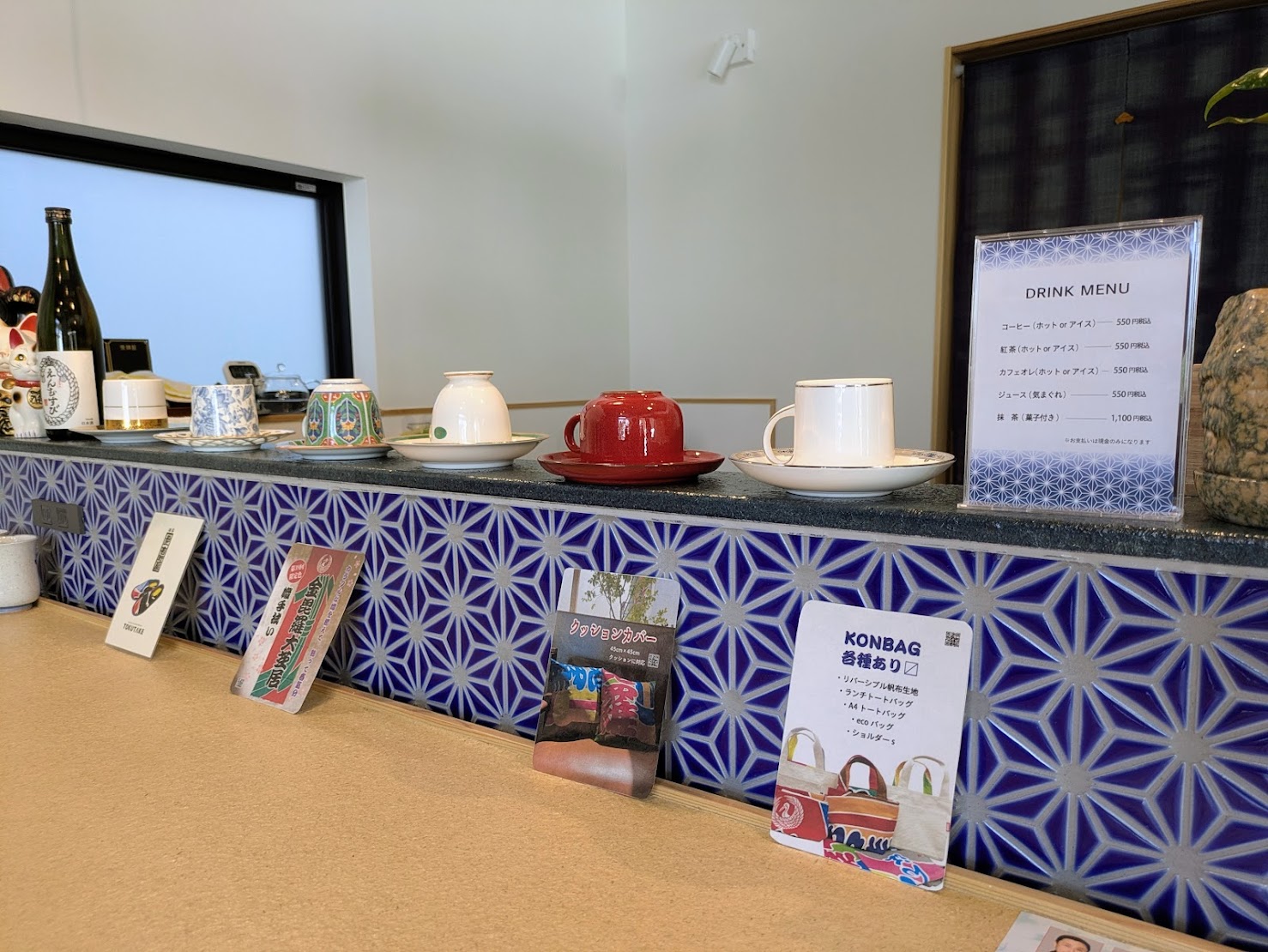 店内には、ブルーの幾何学模様のタイルがおしゃれなカウンター席のカフェスペースが併設されています。レトロなカップとソーサーが並んでいて、見ているだけでも癒されます♪