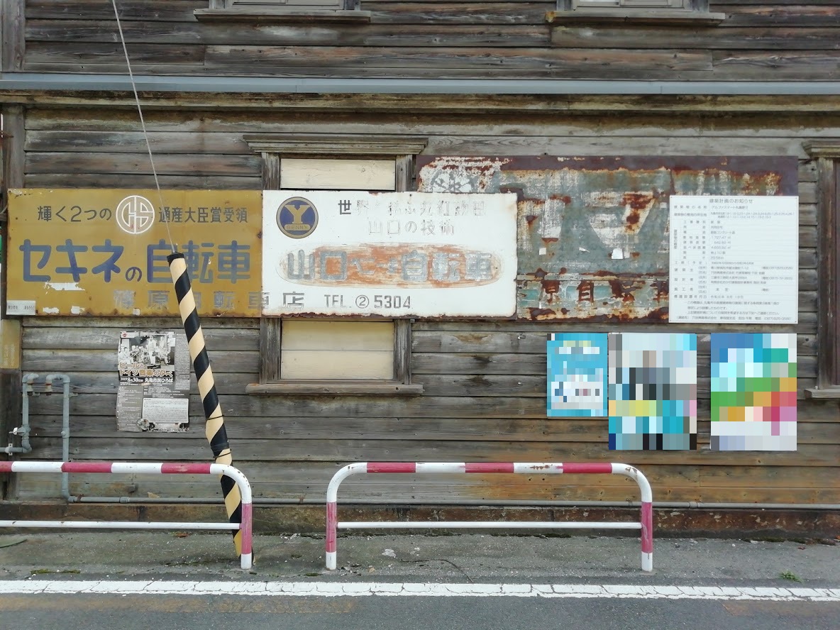 篠原自転車店の壁面に貼られたレトロな看板を見れるのも今のうちです。「山口ベニー号自転車」がとても気になる(笑)