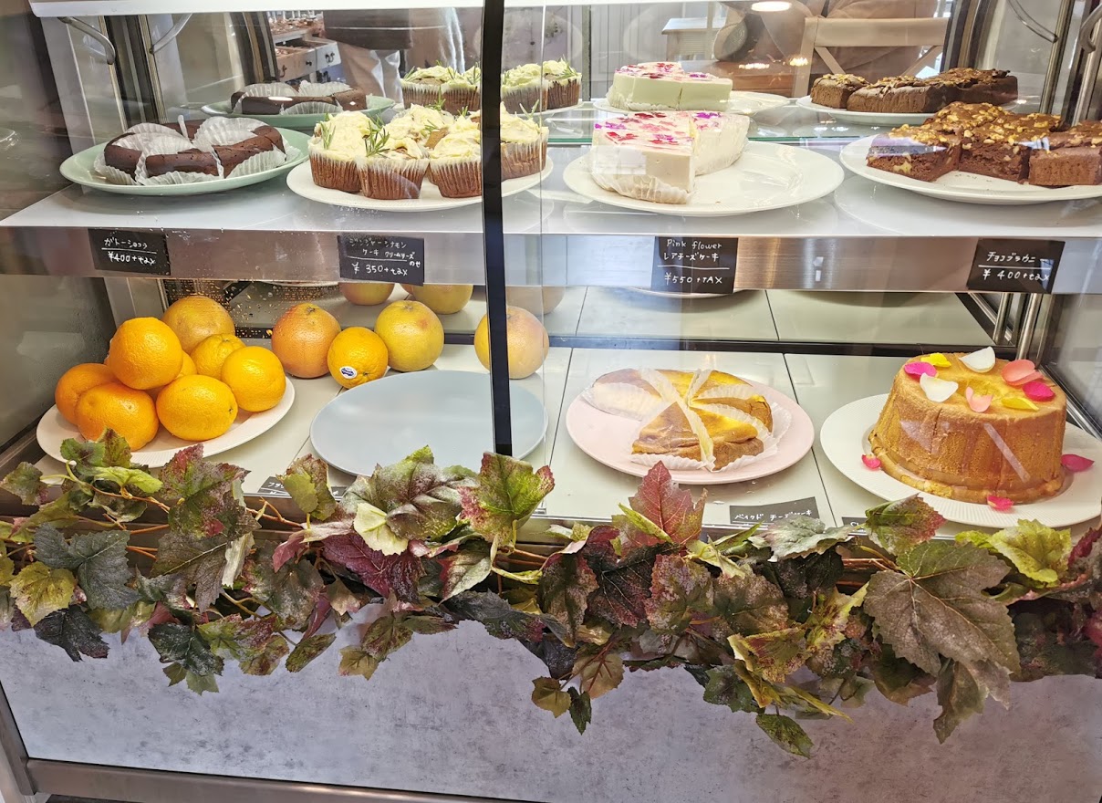 レジ側のショーケースには、スイーツも並んでいて、花びらが散りばめられ華やかなケーキもありましたよ。