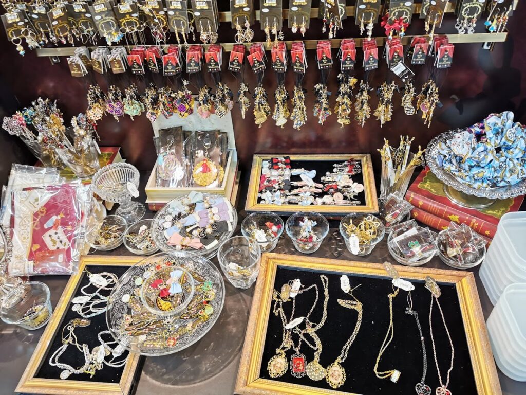 「アリス」の世界観をモチーフにデザインされた、とても可愛らしいピアスやネックレス、髪留めなどの商品が数多く揃えられていました。