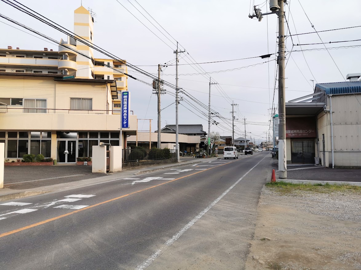 県道46号線沿いにあり、近くには池田養鶏場 直売店や四国巡拝用品センターがあり、南方面へ進むとファミリーマート 丸亀川西北店が左手に見えます。